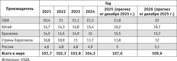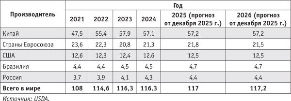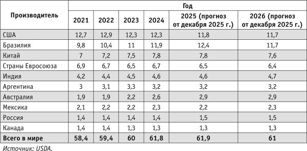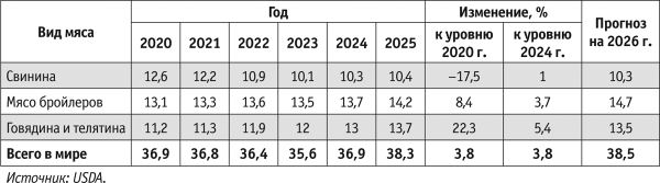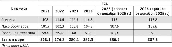 По предварительному прогнозу Министерства сельского хозяйства США (USDA — англ. United States Department of Agriculture), в 2025 г. мировое производство мяса основных видов составило 286,5 млн т, в том числе 117 млн т свинины, 107,6 млн т мяса бройлеров и 61,9 млн т мяса крупного рогатого скота (табл. 1).