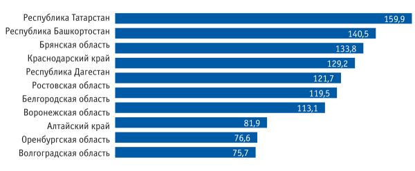Среди регионов России первое место по производству крупного рогатого скота на убой занимает Республика Татарстан (159,9 тыс. т в живой массе). Далее следуют Республика Башкортостан (140,5 тыс. т в живой массе), Брянская область (133,8 тыс. т в живой массе), Краснодарский край (129,2 тыс. т в живой массе) и Республика Дагестан (121,7 тыс. т в живой массе).