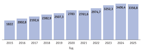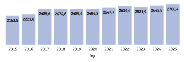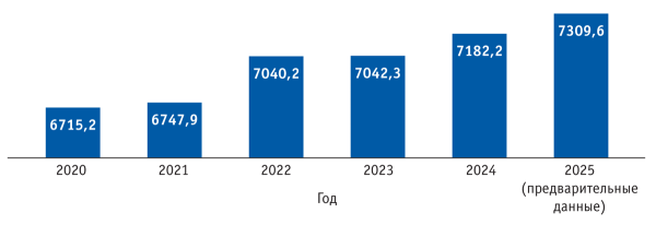 Отечественное мясное птицеводство демонстрирует устойчивый рост показателей. В 2025 г. объем выпуска птицы на убой в живой массе превысил уровень предыдущего года на 1,8% и составил 7,3 млн т. С 2020 г. объемы производства мяса этого вида неуклонно растут (рис. 3).