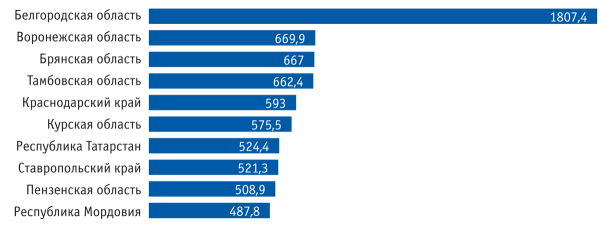 Среди регионов нашей страны первое место по производству мяса занимает Белгородская область (1807,4 тыс. т). Далее следуют Воронежская (669,9 тыс. т), Брянская (667 тыс. т), Тамбовская (662,4 тыс. т) области и Краснодарский край (593 тыс. т).